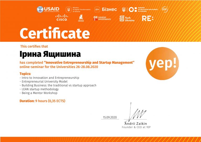 26–28 серпня 2020 р. викладачі кафедри економіки підприємства д.е.н., професор Ящишина Ірина Володимирівна та к.е.н., старший викладач Боднарчук Тетяна Леонідівна взяли участь у тренінгу «Інноваційне підприємництво та управління стартап проєктами», який було організовано стартап інкубатор YEP! спільно з Міністерством освіти та науки України, Міністерством цифрової трансформації України, Дія.Бізнес тощо в рамках пілотного проєкту «Підприємницький університет».