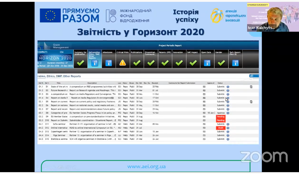 В ході вебінару було представлено повний цикл реалізації проєкту Горизонт 2020 у сфері конвергенції медіа (проєкт COMPACT, № 762128), а саме: процес підготовки і подання проєктної заявки; оцінка проєкту та початок робіт; перша фаза звітності; проблемні питання по ходу виконання проєкту; звітність і підсумкові результати проєкту.