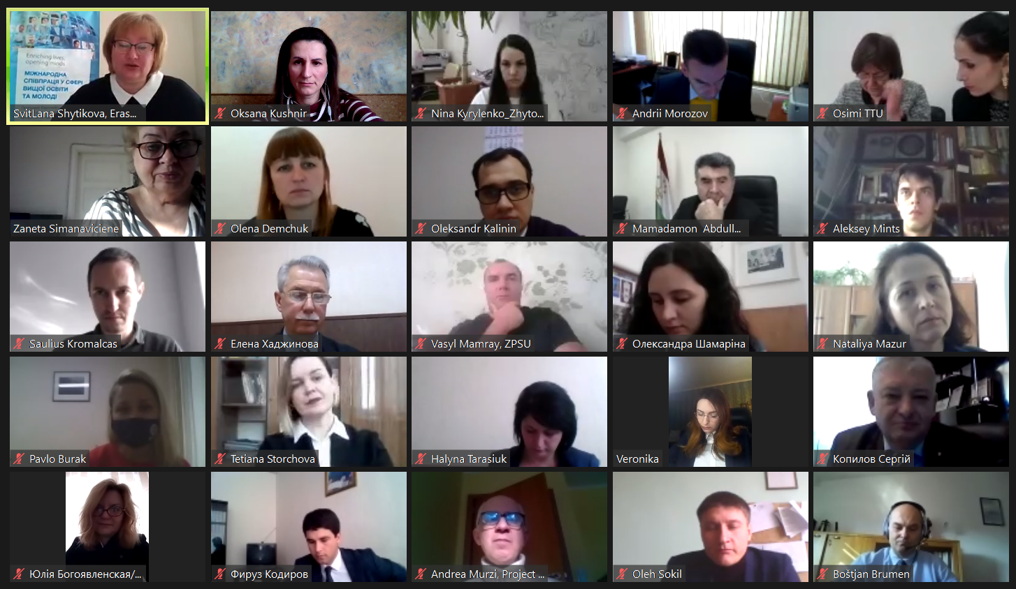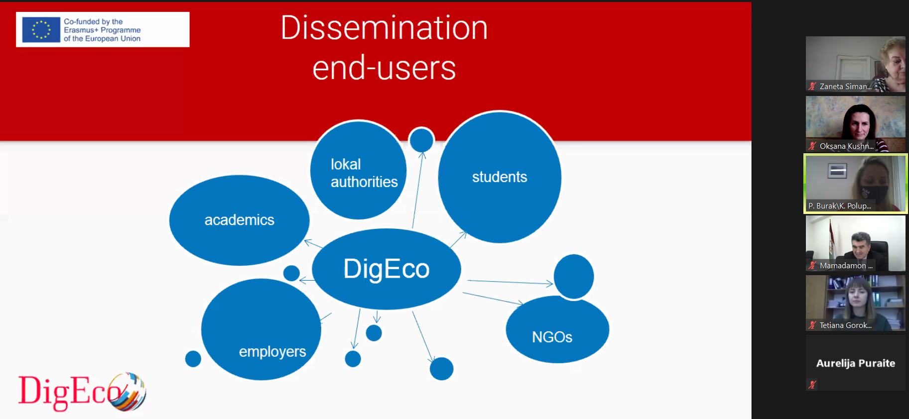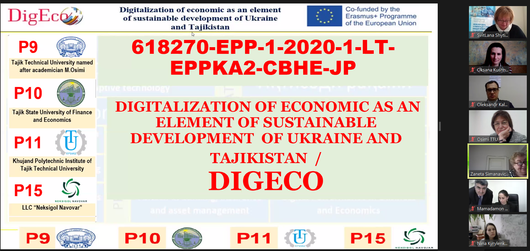 Ці питання спільно обговорили 12.02.2021 р. о 11.00 год. (за Київським часом) з п’ятнадцятьма партнерами з Німеччини, Литви, Словенії, Таджикистану та України в рамках проєкту DigEco. До обговорення долучилися: Світлана Шитікова, координатор програми ЕРАЗМУС+UA (НЕО в Україні); Андреа Мурзі, офіцер проекту EACEA та Олег Шаров, генеральний директор директорату фахової передвищої, вищої освіти Міністерства освіти і науки України.
