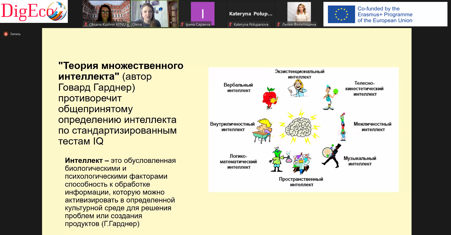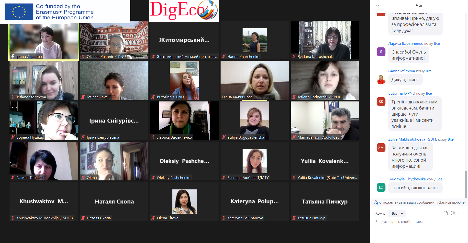 27-28 січня 2022 року викладачі та здобувачі кафедри проходили онлайн тренінги DigEco. Цього разу була розкрита важлива складова проєкту – інклюзивна. Спікерами були: Ірина Саранча – кандидат педагогічних наук, психолог, голова ГО «Паросток», доцент Вінницького державного педагогічного університету імені Михайла Коцюбинського; Олена Омельченко – завідувач відділу науки, міжнародних справ та інклюзивної освіти Вінницького інституту «Відкритий міжнародний університет розвитку людини «Україна», старший викладач кафедри бізнесу та права.