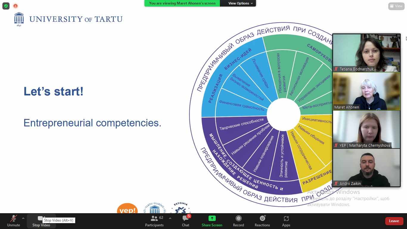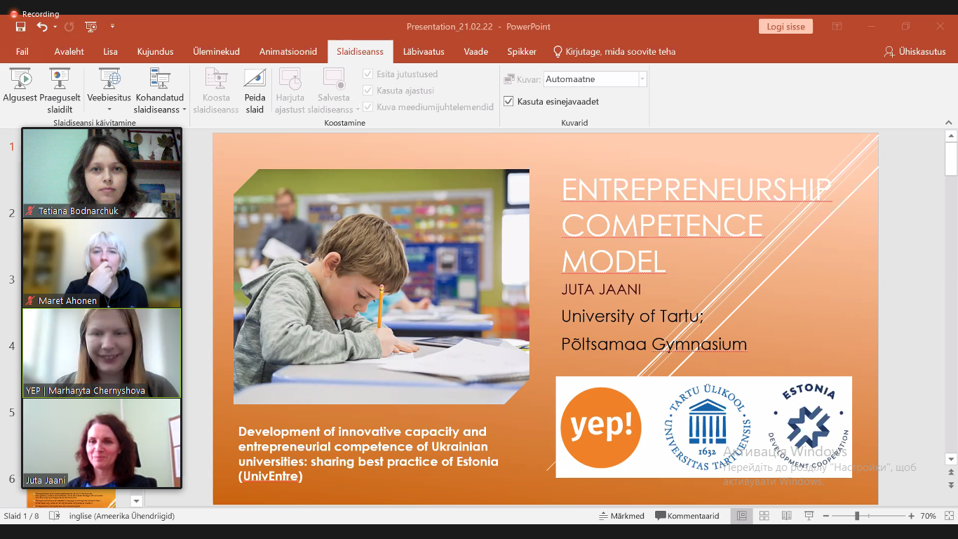 В рамках ініціативи «Підприємницький університет» та нового проєкту UnivEntre 21-22 лютого стартувало міжнародне стажування «Starter Academia – Teaching Entrepreneurship at University» спільно з Університетом Тарту (Естонія) та стартап-інкубатором YEP! Участь у заході бере Боднарчук Т. Л., к. е. н., доцент, ст. викладач кафедри економіки підприємства.