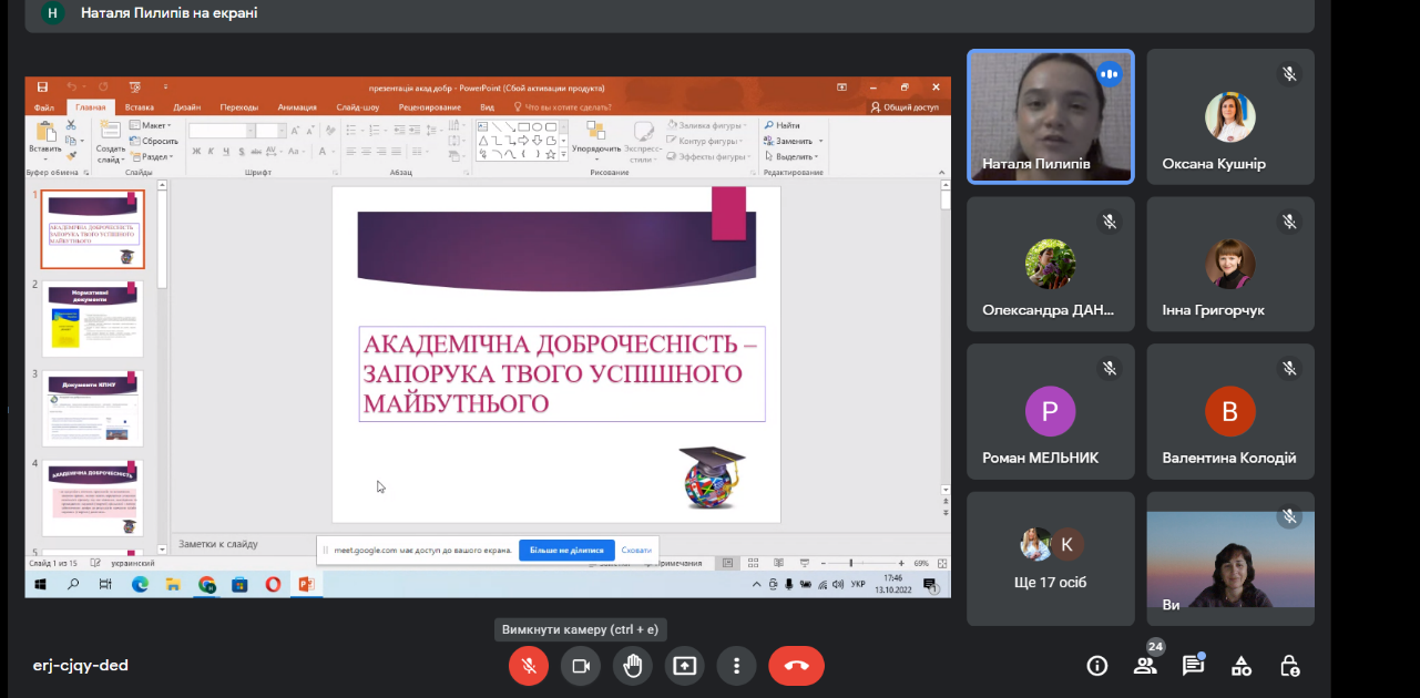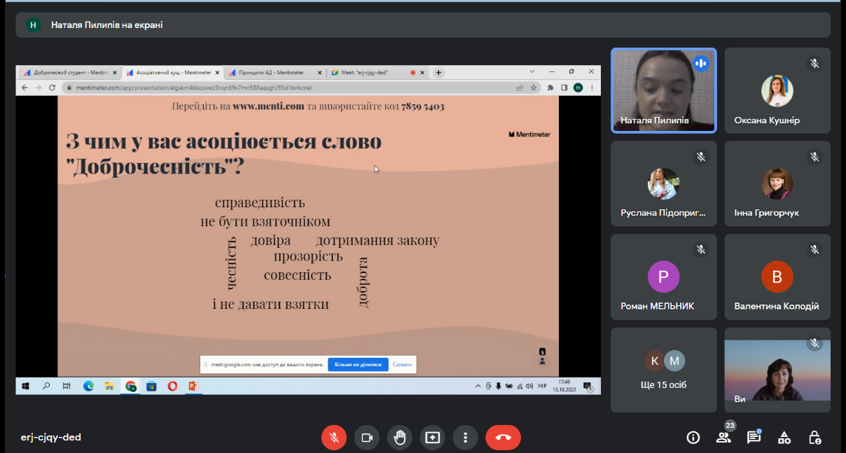 13 жовтня 2022 року відбувся науково-практичний онлайн семінар для студентів природничо-економічного факультету «Правила доброчесності магістрантів у Камʼянець-Подільському національному університеті імені Івана Огієнка».