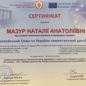 З 24 грудня 2022 р. по 08 лютого 2023 р. завідувач кафедри економіки підприємства, професор Наталія Мазур пройшла навчання за програмою тренінгу «Європейський Союз та Україна: компетентний дослідник», що відбувалось у…