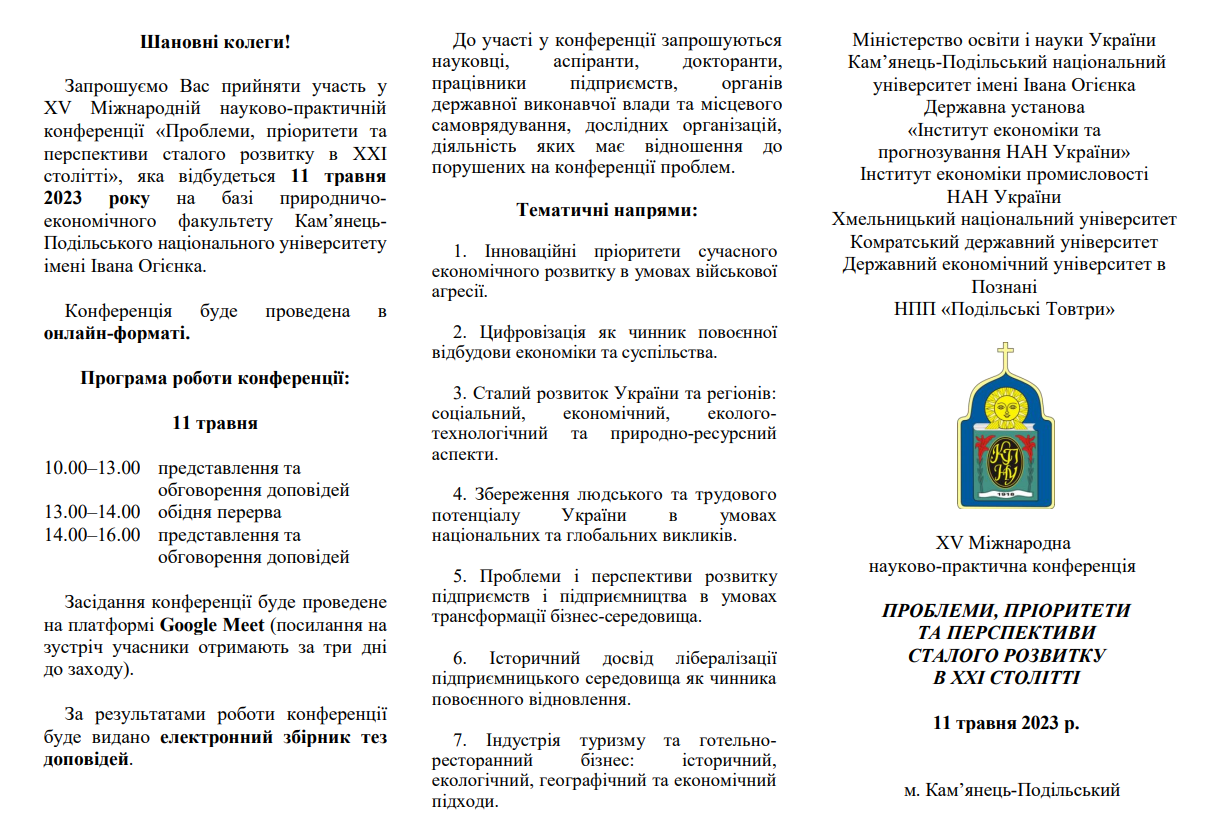 Запрошуємо Вас прийняти участь у ХV Міжнародній науково-практичній конференції «Проблеми, пріоритети та перспективи сталого розвитку в ХХІ столітті», яка відбудеться 11 травня 2023 року в онлайн-форматі.