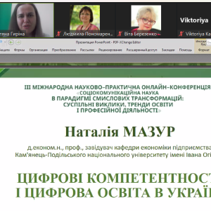 19 травня 2023 року д.е.н., професор, завідувач кафедри економіки підприємства Наталія Мазур виступила на пленарному засіданні ІІІ Міжнародної науково-практичної онлайн-конференції «Соціокомунікаційна наука в парадигмі смислових трансформацій: суспільні виклики, тренди освіти і…