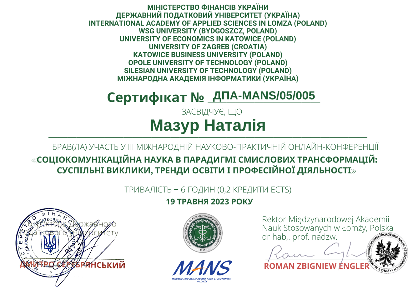 19 травня 2023 року д.е.н., професор, завідувач кафедри економіки підприємства Наталія Мазур виступила на пленарному засіданні ІІІ Міжнародної науково-практичної онлайн-конференції «Соціокомунікаційна наука в парадигмі смислових трансформацій: суспільні виклики, тренди освіти і професійної діяльності», організованої Державним податковим університетом (м. Ірпінь, Україна) разом з закладами вищої освіти Республіки Польща (Міжнародною академією прикладних наук (Ломж), Вищою школою економіки (Бидгощ), Економічним університетом у Катовіцах, Опольським технологічним університетом, Сілезьким технологічним університетом) та Загребським університетом з Хорватії.