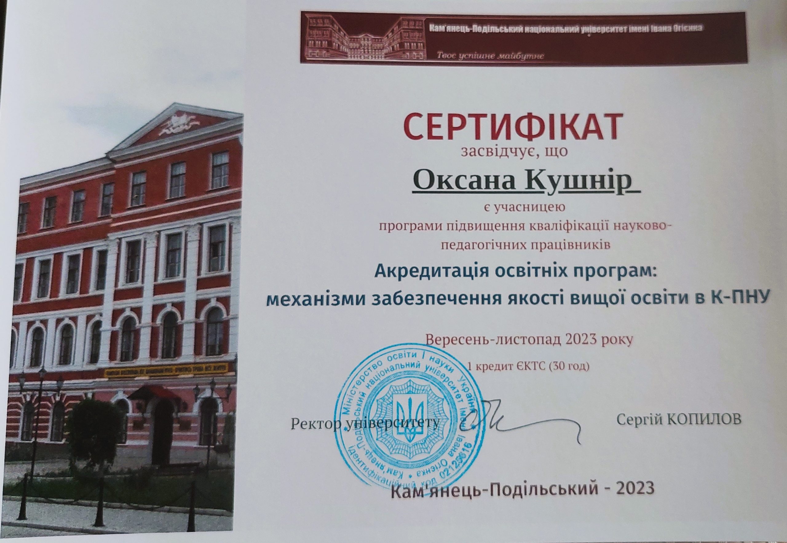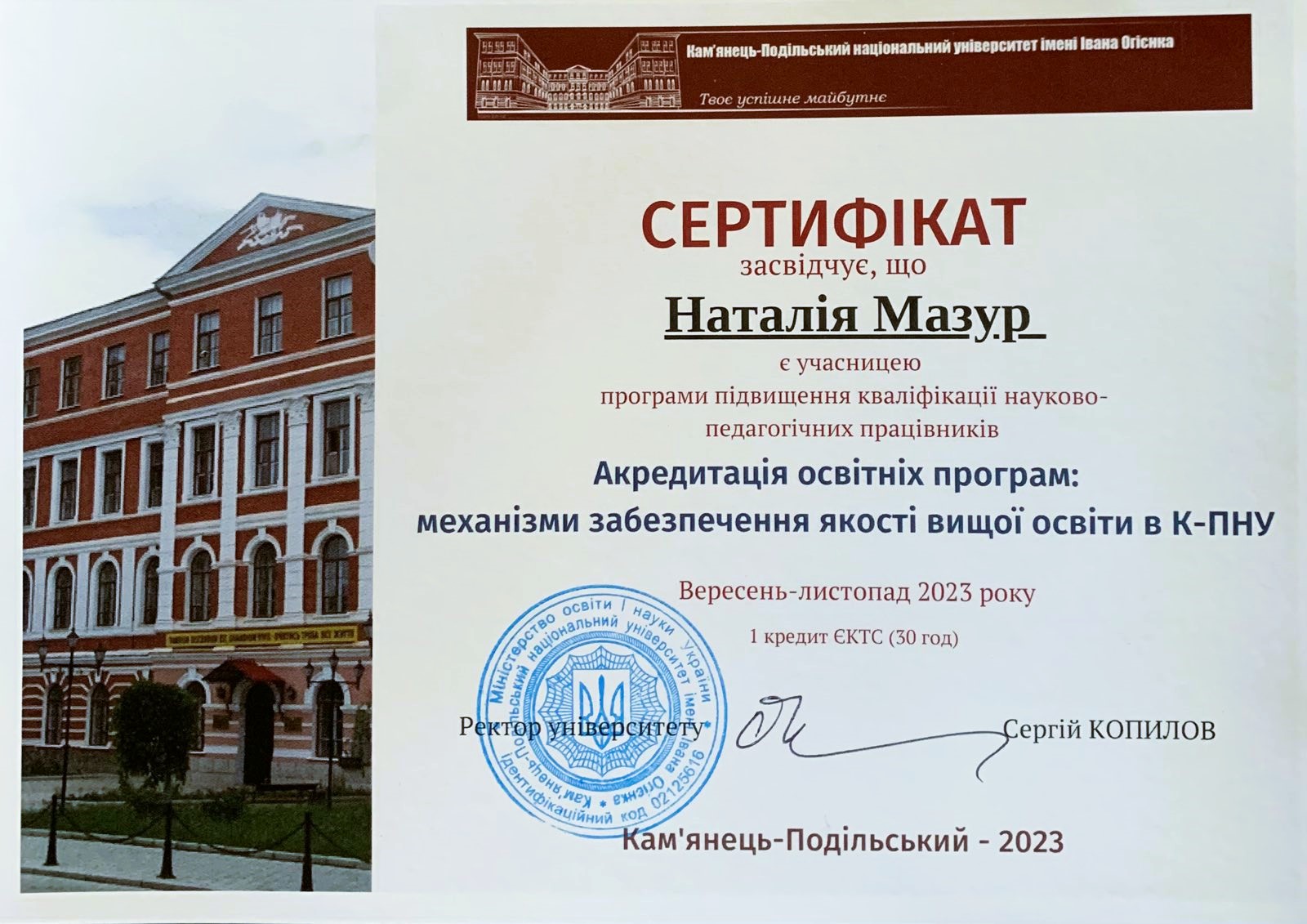 Впродовж вересня-листопада гаранти: професор Наталія МАЗУР та доцент Оксана КУШНІР освітніх програм Облік і оподаткування, Підприємництво і торгівля приймали участь у програмі підвищення кваліфікації науково-педагогічних працівників «Акредитація освітніх програм: механізми забезпечення якості вищої освіти в К-ПНУ». Програма була організована за сприяння навчально-методичного відділу і мала на меті удосконалення психолого-педагогічної, комунікативної, інформаційно-комунікаційної компетентностей гаранта освітньої програми як менеджера в успішній підготовці самооцінювання та проходження акредитаційної експертизи відповідно до сучасних вимог і викликів у галузі вищої освіти.