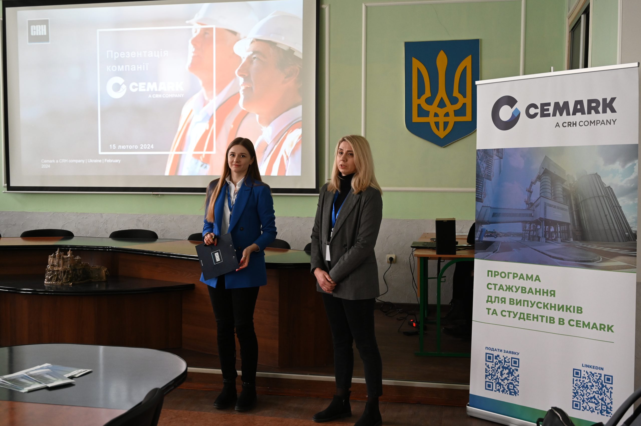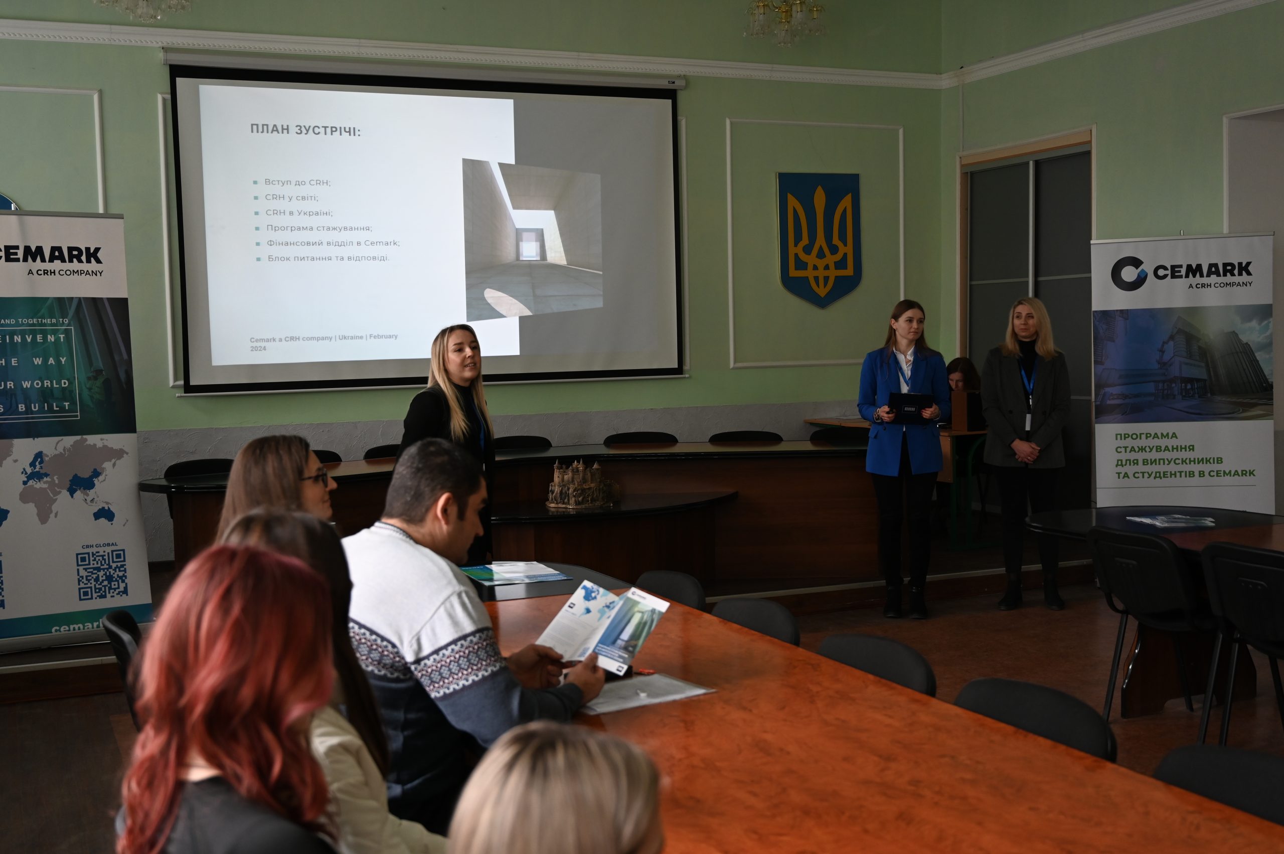 Важливою та актуальною для студентів була представлена Олександрою Ліннік – спеціалістом з розвитку та навчання – інформація щодо програми стажування в компанії, що діє з 2015 року на базі Кам’янець-Подільського цементного заводу, основною метою якої є залучення молодих талантів до цементного бізнесу та формування нового покоління лідерів компанії. Так, учасники програми здобувають практичні навички, необхідні для побудови успішної кар’єри та критично важливі для роботи в міжнародній компанії. Вони мають можливість вивчити англійську мову, відвідувати тренінги із самоуправління та командної взаємодії, презентації та управління проєктами. Також стажери працюють над індивідуальними проєктами та за результатами їх захисту перед керівництвом Cemark приймається рішення про працевлаштування на одному з підприємств в Україні. На таку програму стажування запрошують, серед інших, економістів, бухгалтерів, спеціалістів з договірної роботи.