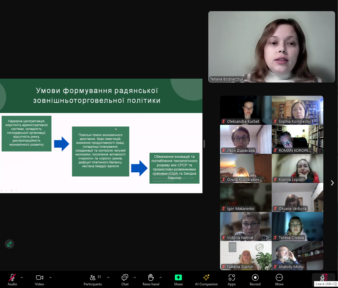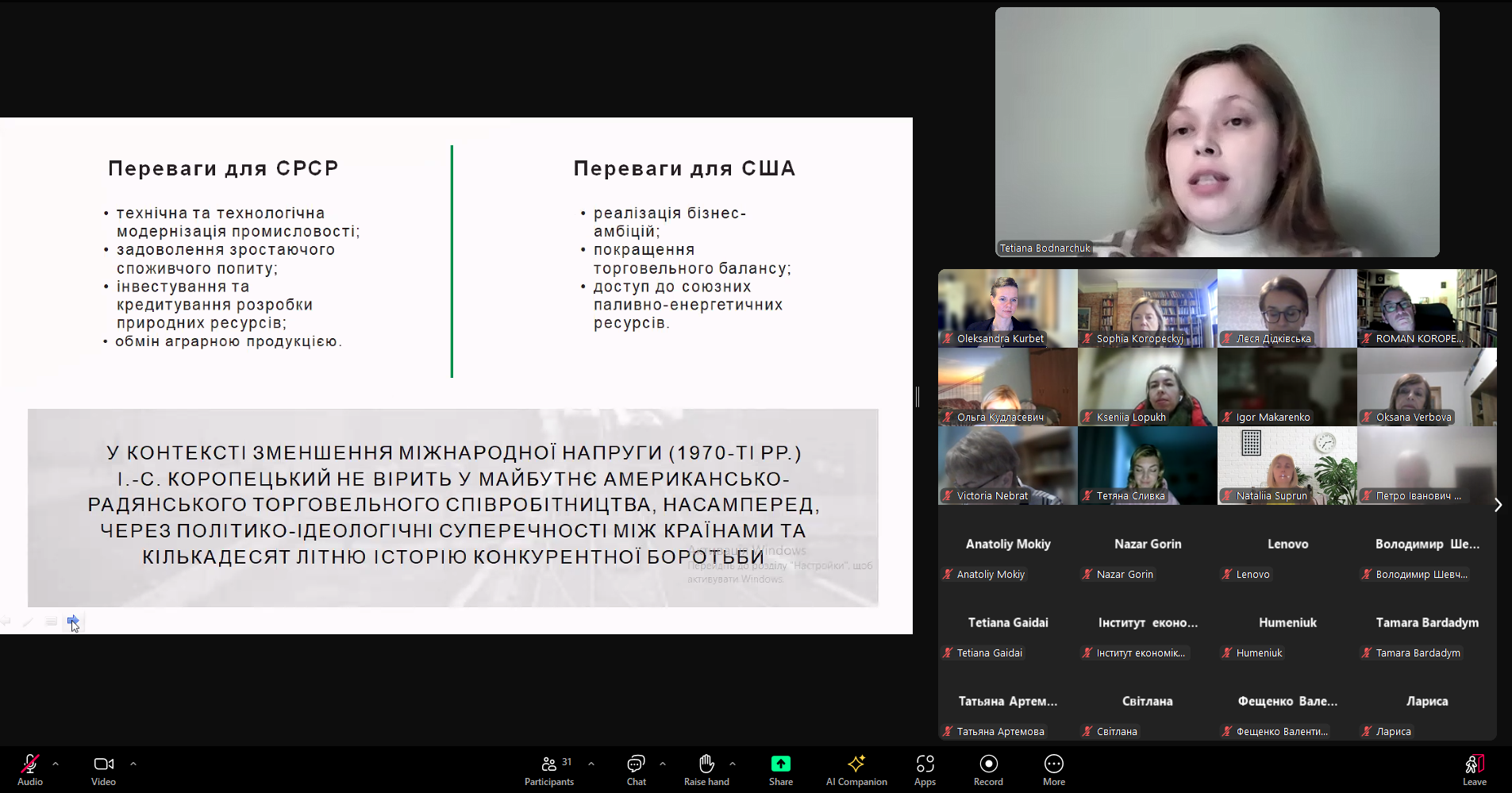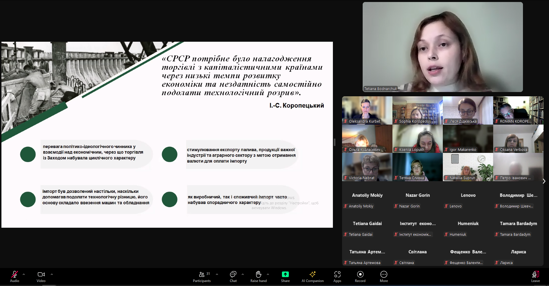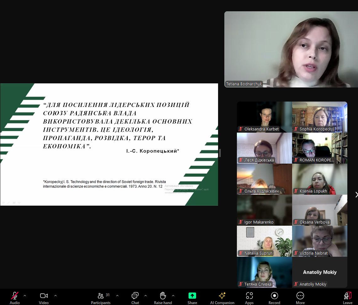 В межах заходу Тетяна Леонідівна виступила з доповіддю на тему «І.-С. Коропецький про радянську зовнішньоторговельну політику», в якій висвітлила неординарні та актуальні на сьогодні ідеї та міркування вченого-економіста щодо специфіки налагодження торговельно-економічної взаємодії між Заходом та Радянським Союзом у ХХ ст.