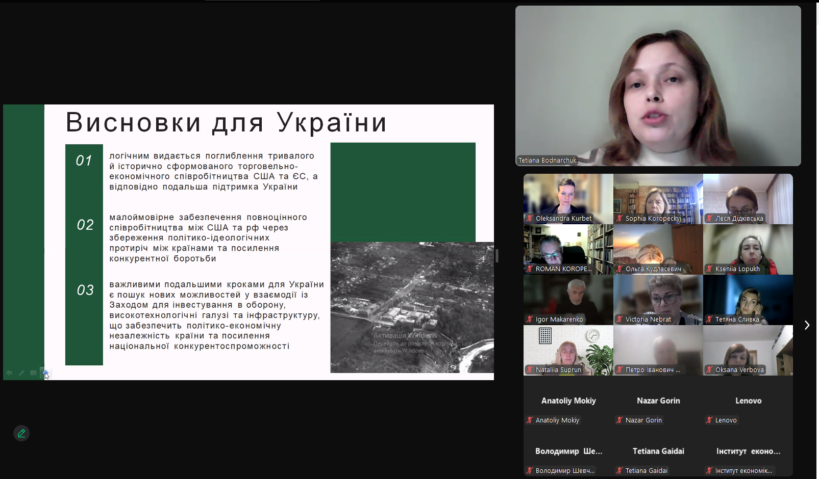 Апелюючи до економічної історії та наукової думки проф. Коропецького, доповідач висловила думки щодо подальшої реалізації зовнішньоекономічної стратегії України в контексті сучасних змін в геополітичному просторі та ризику «перезавантаження» американсько-російських відносин. Серед них виокремлено важливість продовження євроінтеграційного курсу України, пошуку можливостей поглиблення співпраці із США (як в оборонній, так й економічній галузях), а також зосередження уваги на аспекті ендогенізації розвитку національної економіки.