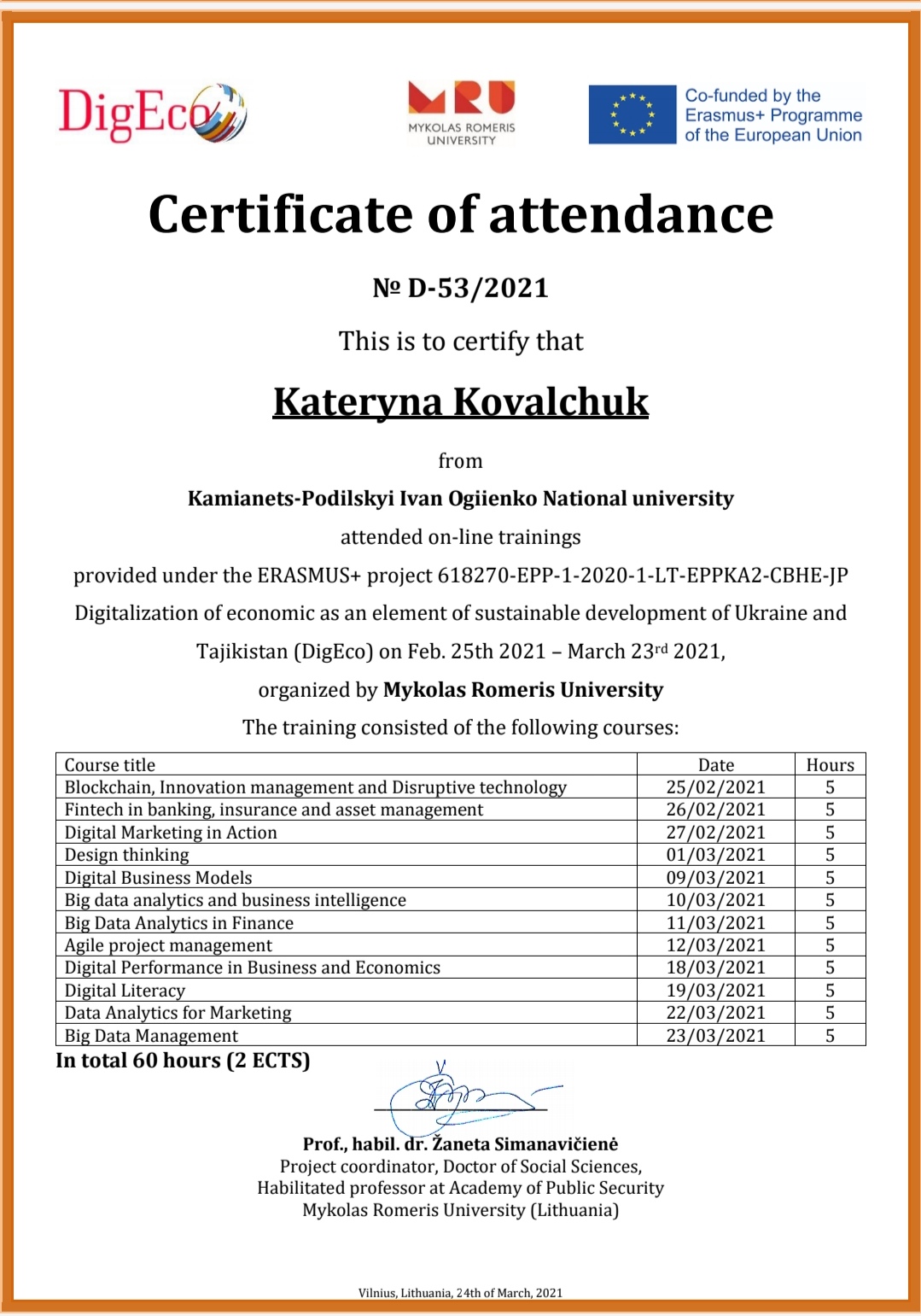 Студентка магістратури спеціальності 071 Облік і оподаткування Катерина Ковальчук долучилася до онлайн-стажування від Університету Миколаса Ромеріса у формі онлайн-тренінгів в рамках проєкту «Digitalization of economic as an element of sustainable development of Ukraine and Tajikistan (DigEco)» обсягом 60 годин (2 кредити ECTS), яке проходило з 25 лютого по 23 березня 2021 р. Участь підтверджено сертифікатом.