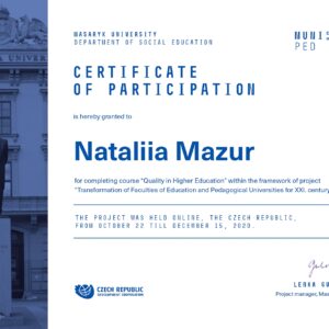 15 грудня відбулось урочисте закриття осіннього етапу проєкту «Зміни педагогічних факультетів та університетів у 21 столітті», проведеного Чеським університетом Масарика (Masarykova univerzita / Masaryk University). Д.е.н., професор, завідувач кафедри економіки підприємства Мазур Наталія…
