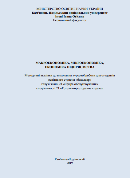 Макроекономіка, мікроекономіка, економіка підприємства. Методичні вказівки до виконання курсової роботи для студентів освітнього ступеня «бакалавр» галузі знань 24 «Сфера обслуговування» спеціальності 21 «Готельно-ресторанна справа» / Ящишина І.В., Буторіна В.Б., Олійник О.С. За заг. ред. д.е.н, проф. Ящишиної І.В. – Кам’янець-Подільський : КПНУ імені Івана Огієнка, 2019. – 36 с. |