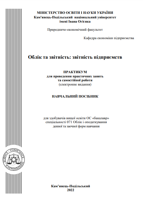 Навчальний посібник «Практикум для проведення практичних занять та самостійної роботи» (електронне видання) підготовлений відповідно до програми курсу «Облік та звітність: звітність підприємств» з врахуванням нових законодавчих та нормативно-правових актів, положень та вказівок з економічних та правових питань, а також відповідно до вимог національних положень (стандартів) бухгалтерського обліку. Мета вивчення дисципліни полягає у формуванні в майбутніх фахівців знань щодо складу, структури, змісту та порядку складання і подання фінансової, статистичної та внутрішньогосподарської звітності. Особлива увага приділяється фінансовій звітності, яка є основою створення системи розкриття інформації про результати діяльності підприємств України для зовнішніх користувачів: власників, кредиторів, контрагентів. Завдання – теоретична підготовка та формування практичних навичок здобувачів вищої освіти з питань бухгалтерського обліку, оподаткування та звітності та їх сучасної парадигми в системі управління підприємством. Найменування підприємств, місце їх розміщення, прізвища посадових осіб, цифрові та інші дані, наведені в практикумі, є умовними і довідковим матеріалом слугувати не можуть. |